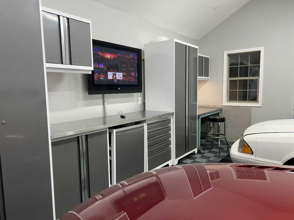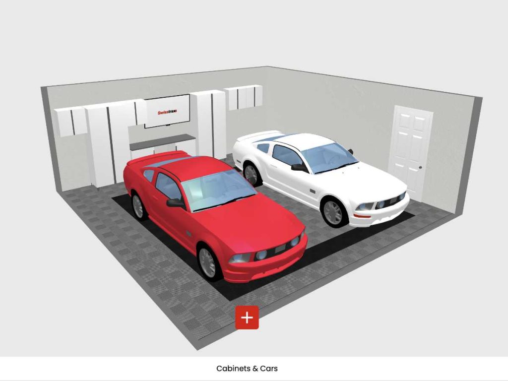 I made a list of what I needed for my “dream garage” and established a budget. I wanted a clean and modern look. I wanted some cabinets but I didn’t want to spend thousands of dollars and, with a 22′ x 22′ garage, I didn’t have a lot of space to work with. Having a budget in place, I went to the designer tool on the Swisstrax flooring site for my inspiration. Besides the flooring, it let me add other details such as doors, cabinets and cars.