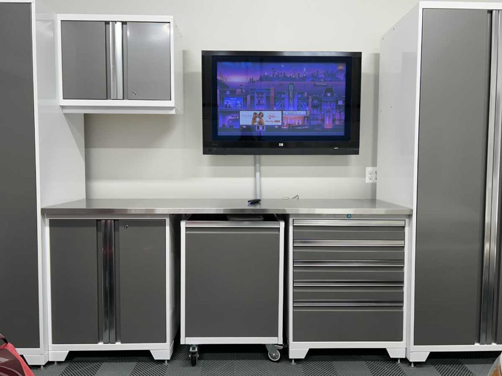 The cabinets I ordered were discounted for the month of October. They weren’t the exact configuration I wanted but, with the $600 discount being offered, I decided to go ahead with them. I also ordered directly through NewAge a mobile utility cart and an 84″ work top since setting up the cabinet array with the two 56″ worktops would have been just a little too long for what I wanted. I wanted some space on either end of the cabinet array and to have an area that I could use as a desk.