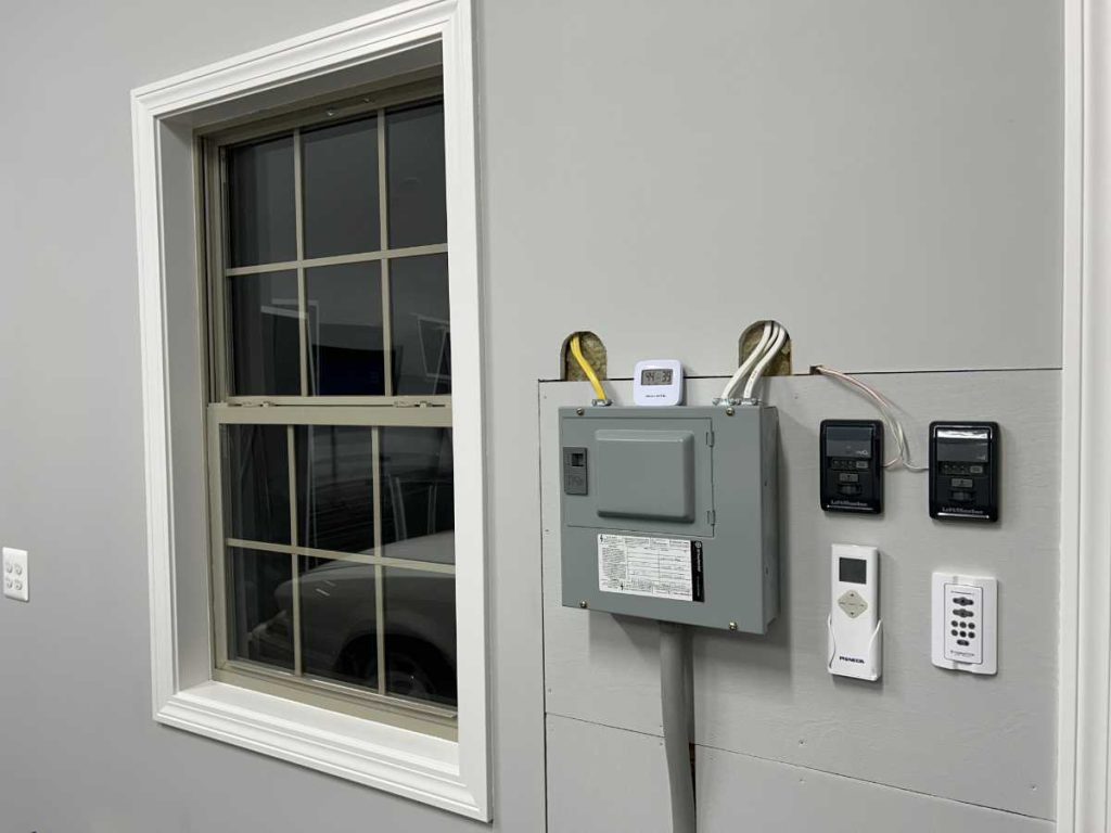 After the cabinet install, I spent a bunch more time on some finishing touches. I am pretty proud of my work in trimming out the windows and door. I also had to deal with the area around the electrical panel. I backed the whole area with plywood replacing the little piece of plywood on which my electricians had mounted the electrical box. Ideally, I would have wanted this all to be drywalled with no seams. But, with it being plywood, I am free to mount other stuff on there like my garage door controllers, my minisplit remote and my fan remote. And, hey, it’s only a garage.