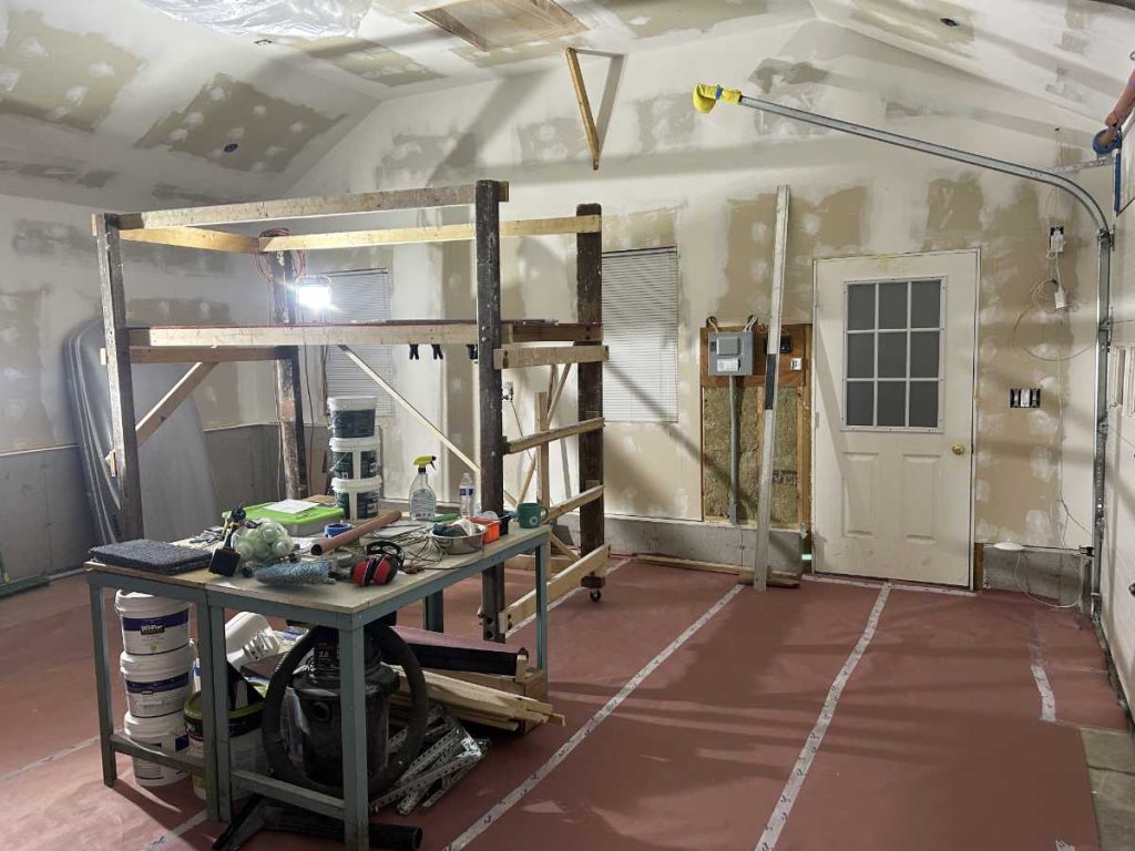 With that vision as motivation, I returned to working on it at the end of October 2025. I completed hanging the drywall with plans to finish that, tape it and paint it and to then finish out the space as I had wanted all those years ago when I first had the garage built. I knew it would be a lot of work but, like everything I do, it went much slower than expected. I took a couple weeks off from work to focus solely on it and I worked nearly every night and weekend on it for almost three months. The scaffolding was indispensable for the drywall hanging, taping and painting.