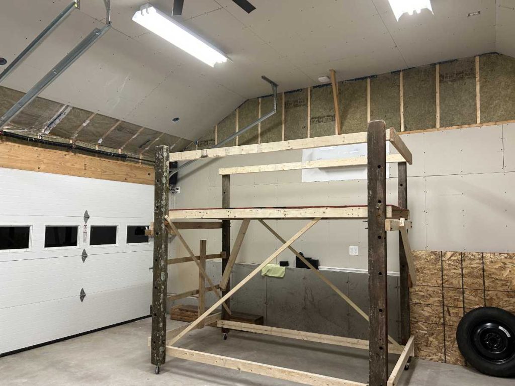 Probably one of the best and most useful things that I have ever made was the scaffolding that I used on this project. Having used just a ladder to do the hanging, taping and painting in my other garage, I knew that scaffolding would make those tasks much less painful. I knew that I would need scaffolding across a long period of time so renting was not an option. Buying was not either as it is very expensive.