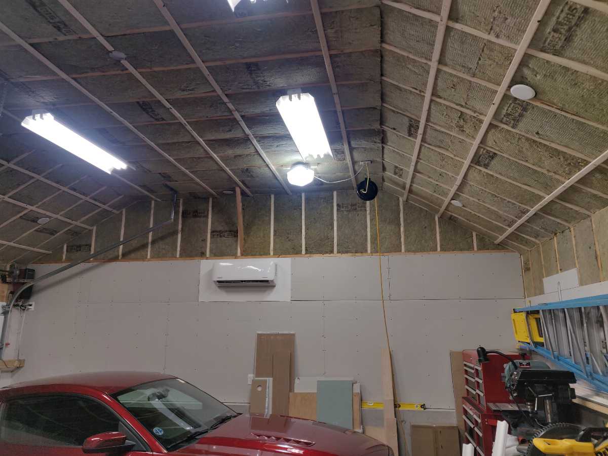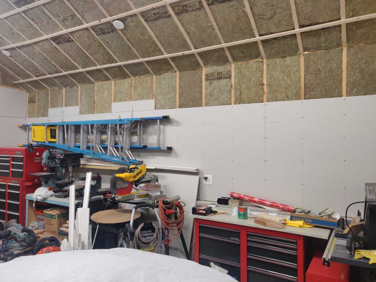 Two years went by with the garage in this chaotic state. My next pass was to drywall the ceiling. For this, I needed to rent a drywall lift. I did that in the fall of 2023. That work was done across a few weekends. I rented the lift for a day or two each weekend and completed the high part of the ceiling which is 10 1/2′ and also most of the sloped parts of the ceiling. I completed everything for which I thought I had needed the lift.