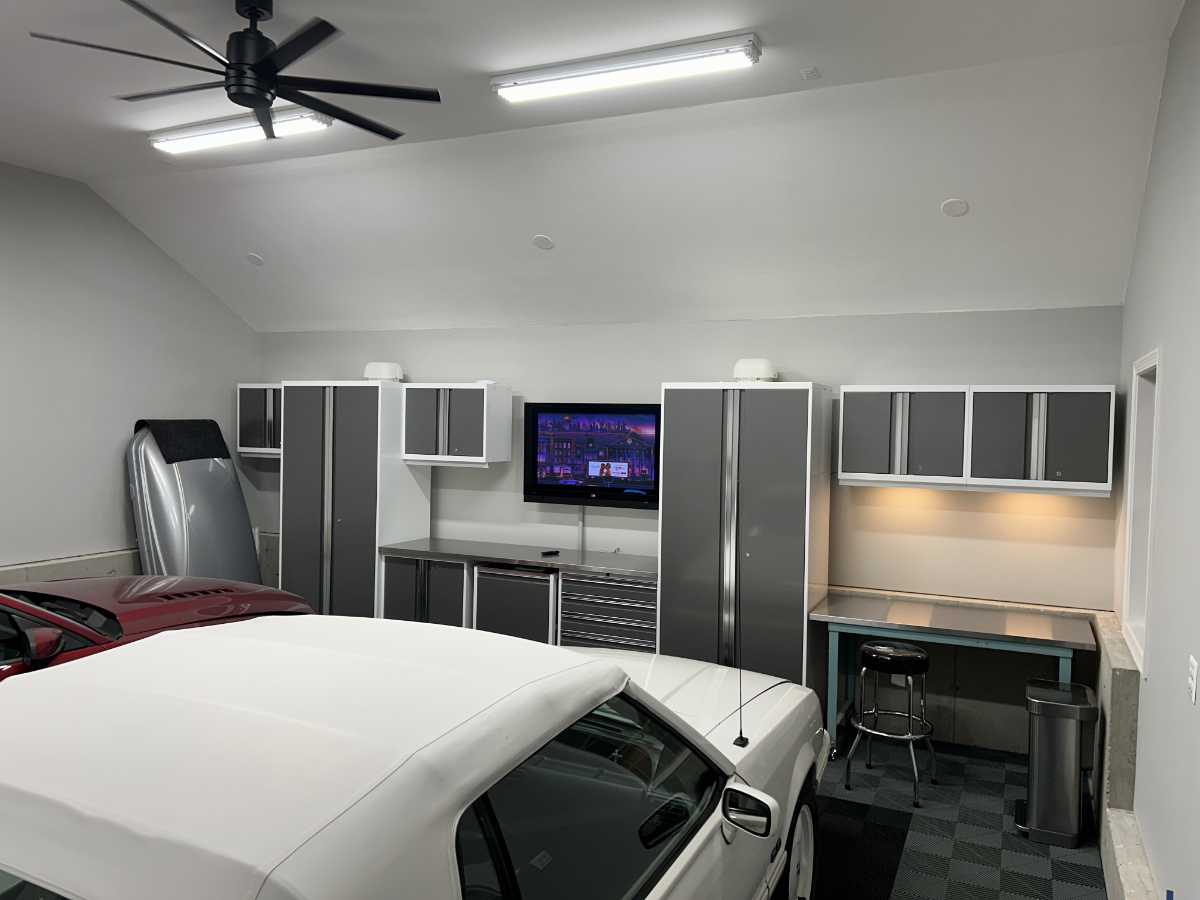 After the cabinet install, I spent a bunch more time on some finishing touches. I am pretty proud of my work in trimming out the windows and door. I also had to deal with the area around the electrical panel. I backed the whole area with plywood replacing the little piece of plywood on which my electricians had mounted the electrical box. Ideally, I would have wanted this all to be drywalled with no seams. But, with it being plywood, I am free to mount other stuff on there like my garage door controllers, my minisplit remote and my fan remote. And, hey, it’s only a garage.