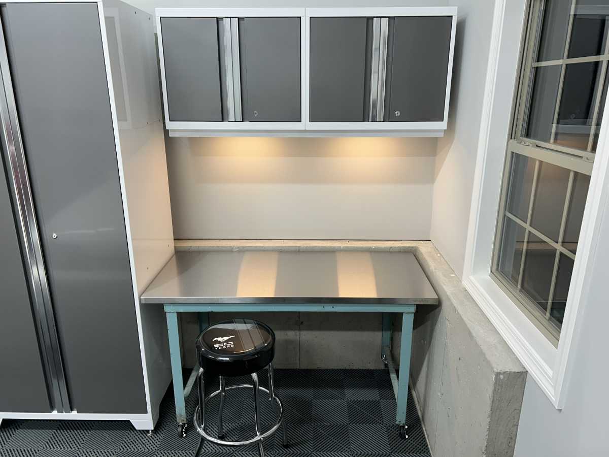 Once the painting was complete, I moved on to flooring. For flooring, I installed Swisstrax Ribtrax Pro. It was possibly the most satisfying step in my entire garage transformation. The time required was low (only a few hours) and the level of transformation was huge. I went with slate grey with a jet black accent border. The jet black border was strategically placed so that, if my cars were inside of it, the chance of hitting a car door on the wall or the entry door on the car was not likely.